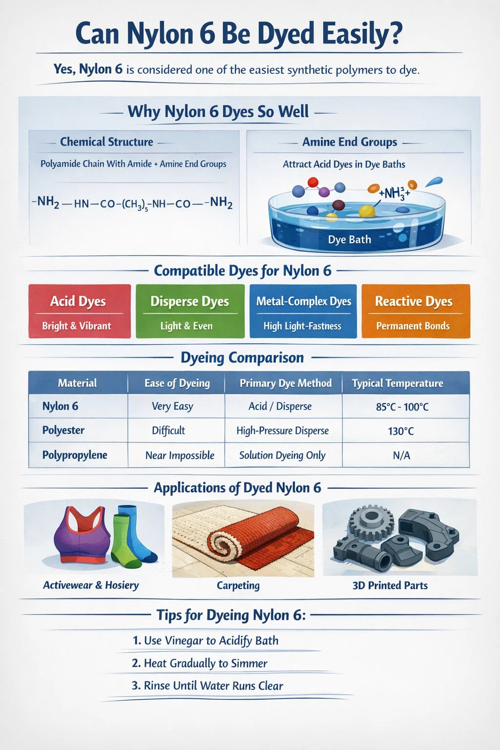 হ্যাঁ, নাইলন 6 রং করার জন্য সবচেয়ে সহজ সিন্থেটিক পলিমারগুলির মধ্যে একটি হিসাবে বিবেচিত হয় , বিশেষ করে যখন পলিয়েস্টার বা পলিপ্রোপিলিনের মতো অন্যান্য প্লাস্টিকের সাথে তুলনা করা হয়। এর অনন্য রাসায়নিক কাঠামোতে অসংখ্য প্রতিক্রিয়াশীল সাইট রয়েছে যা রঞ্জক অণুগুলিকে শক্তিশালী, স্থায়ী বন্ধন তৈরি করতে দেয়। Colorants জন্য এই উচ্চ সখ্যতা মানে নাইলন 6 অর্জন করতে পারে প্রাণবন্ত, গভীর রং এবং চমৎকার রঙ দৃঢ়তা অপেক্ষাকৃত কম তাপমাত্রায় প্রমিত জলীয় রঞ্জক প্রক্রিয়া ব্যবহার করে।