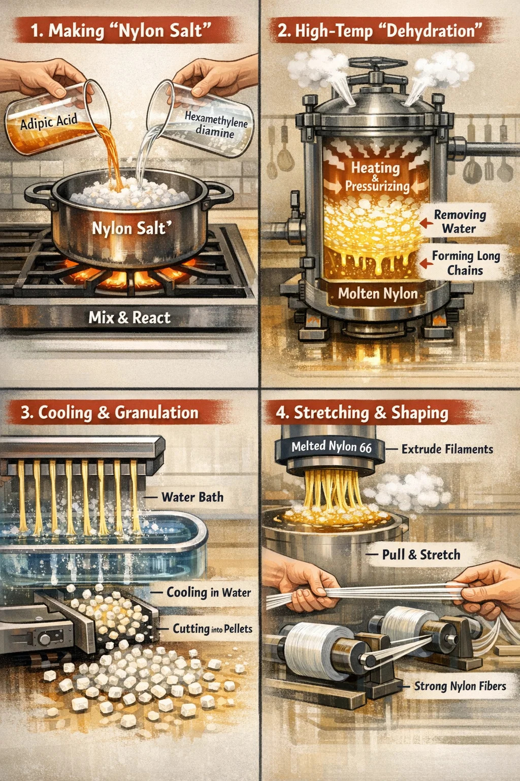 নাইলন 66 তৈরির জন্য এখানে সরলীকৃত পদক্ষেপ রয়েছে: