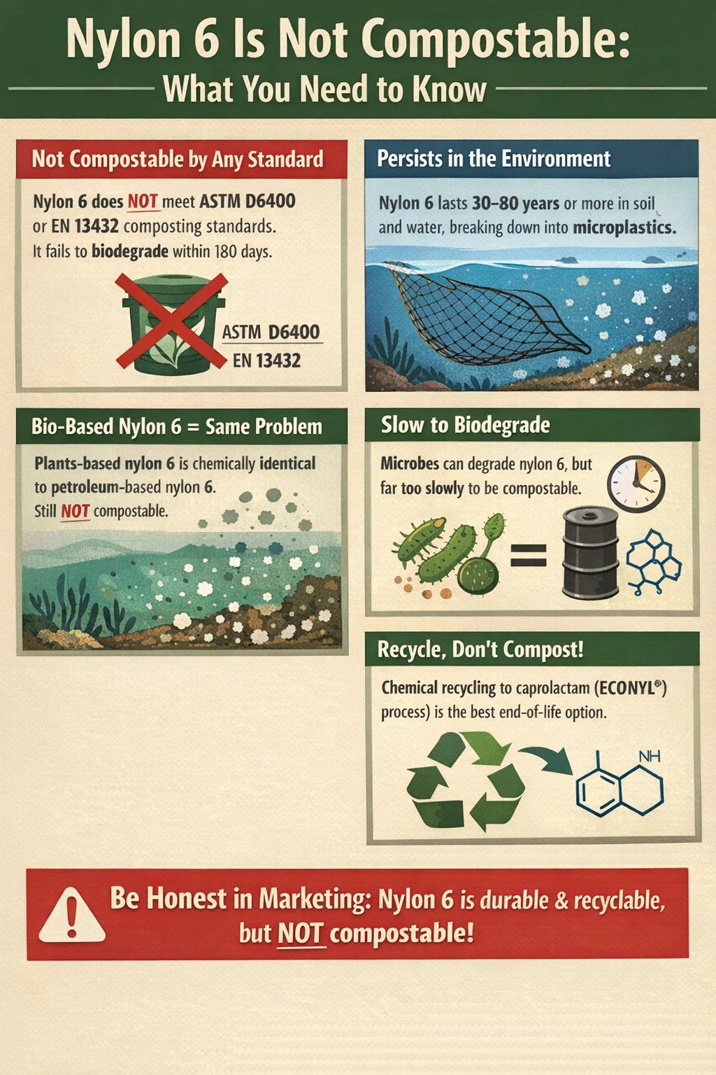 - সবুজ দাবির উপর নিয়ন্ত্রক চাপ বাড়ছে; নাইলন 6 কে কম্পোস্টেবল বা বায়োডিগ্রেডেবল হিসাবে লেবেল করা ভুল এবং সম্ভাব্য একাধিক বিচারব্যবস্থায় অবৈধ।