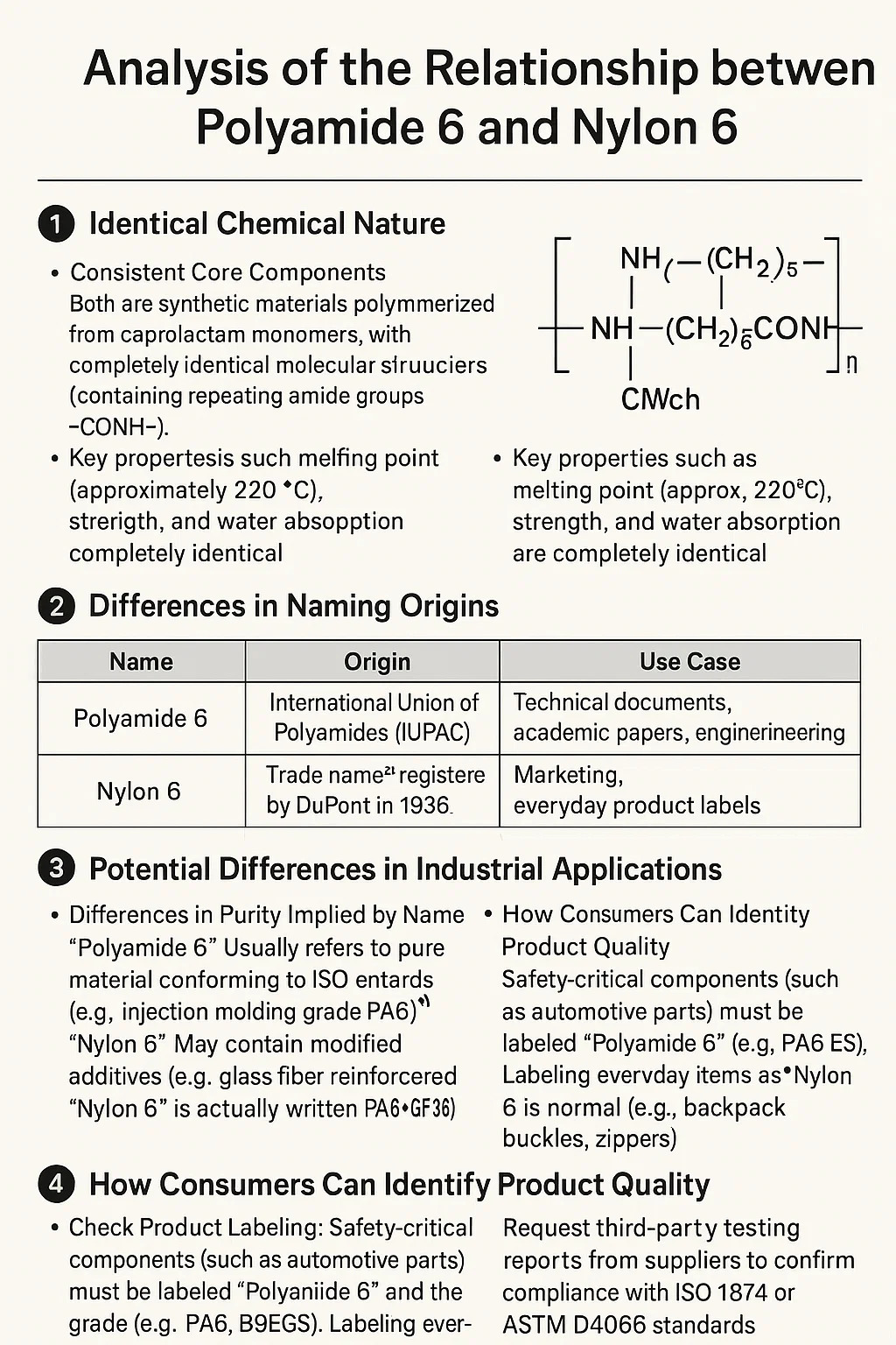 • সাপ্লাই চেইন লুকানো নিয়ম: কিছু সরবরাহকারী " নাইলন 6 " পুনর্ব্যবহৃত উপাদান মিশ্রণ বিক্রি করার জন্য লেবেল (খরচ কমাতে), যখন "পলিমাইড 6" এর জন্য একটি রচনা প্রতিবেদন প্রয়োজন।