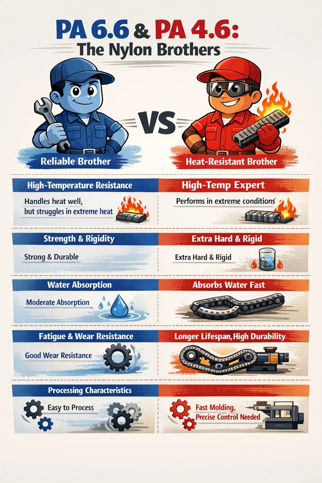 নাইলন পরিবারে, PA 6.6 এবং PA 4.6 দুই ভাইয়ের মতো, চেহারায় একই রকম কিন্তু স্বতন্ত্র ব্যক্তিত্ব এবং ক্ষমতা সহ। উভয়ই পলিমাইড পরিবারের অন্তর্গত, তবে উচ্চ তাপমাত্রা এবং উচ্চ-চাপ প্রয়োগের সাথে মোকাবিলা করার সময় তারা বেশ ভিন্নভাবে কাজ করে।
