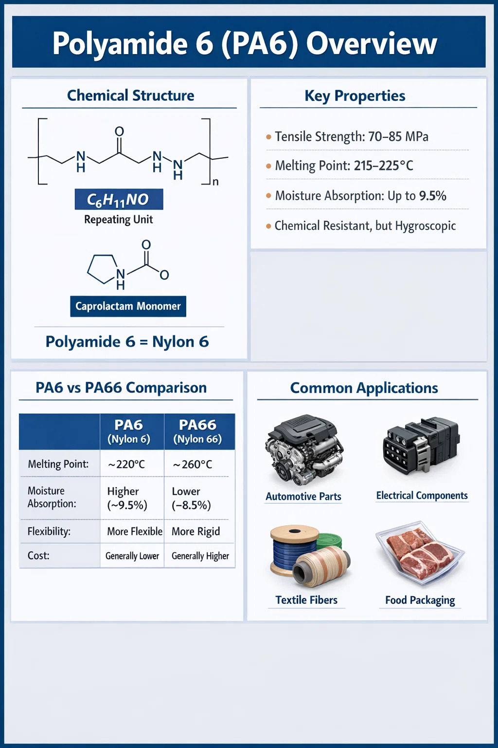 বিশ্বব্যাপী, পলিমাইড 6 হল একটি শীর্ষ-ভোক্ত ইঞ্জিনিয়ারিং থার্মোপ্লাস্টিক। বার্ষিক উৎপাদনের পরিমাণ ছাড়িয়ে গেছে ৪ মিলিয়ন মেট্রিক টন , এবং উপাদানটি স্বয়ংচালিত এবং ইলেকট্রনিক্স থেকে টেক্সটাইল এবং খাদ্য প্যাকেজিং পর্যন্ত শিল্পের অবিচ্ছেদ্য অংশ। PA6 কি বোঝায় তা বোঝা মাত্র শুরুর বিন্দু — এর রসায়ন, কর্মক্ষমতা বৈশিষ্ট্য এবং প্রক্রিয়াকরণ আচরণ সংজ্ঞায়িত করে কেন এটি বাণিজ্যিকভাবে প্রভাবশালী হয়ে উঠেছে।