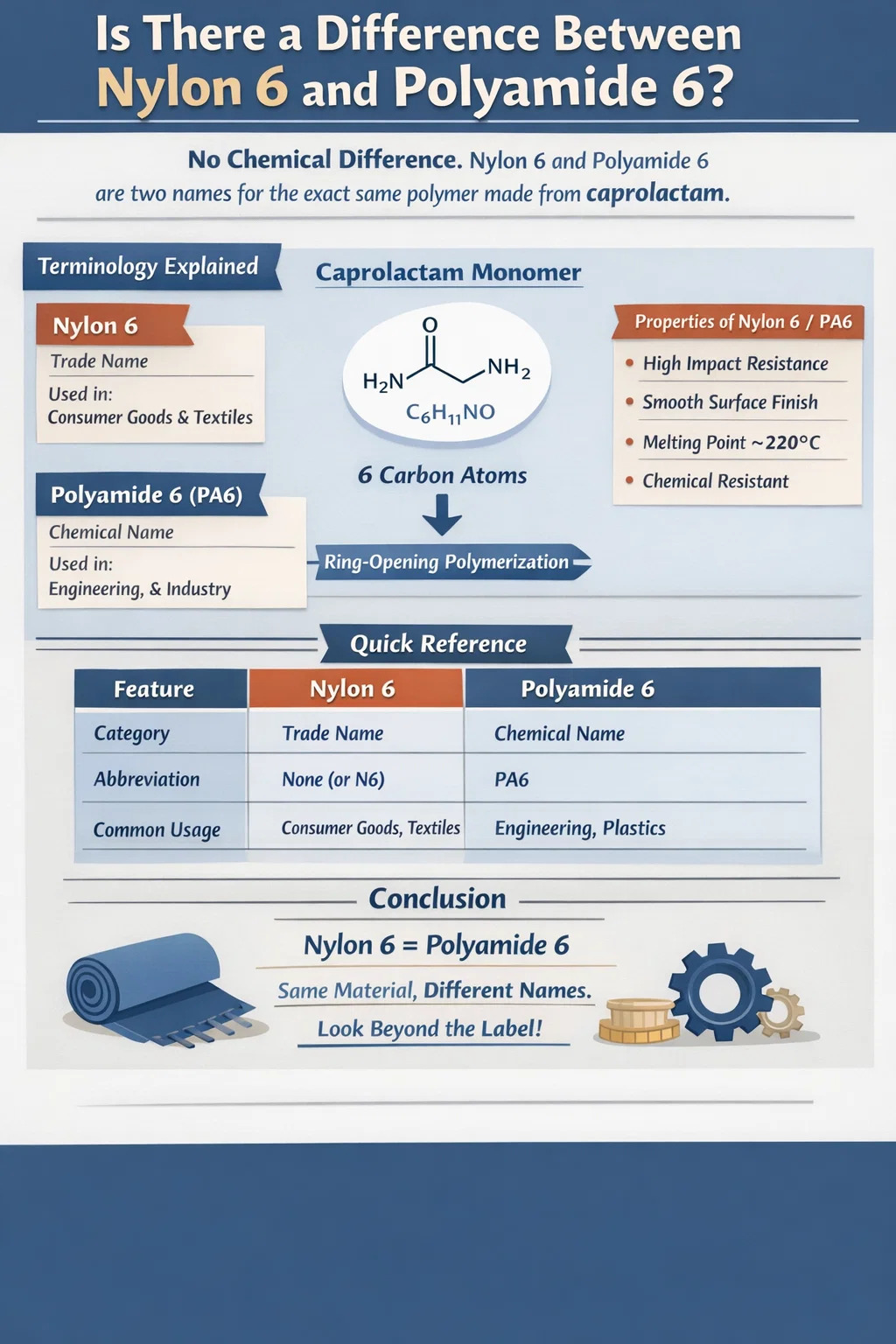 সহজভাবে বলতে গেলে: নাইলন 6 এবং পলিমাইড 6 এর মধ্যে কোন রাসায়নিক পার্থক্য নেই। তারা ঠিক একই পলিমার জন্য দুটি ভিন্ন নাম. "নাইলন" হল সুপরিচিত বাণিজ্য নাম যা মূলত ডুপন্ট দ্বারা তৈরি করা হয়েছিল, যখন "পলিমাইড" হল বিজ্ঞান এবং প্রকৌশলে ব্যবহৃত আনুষ্ঠানিক রাসায়নিক নাম। যখন দেখবেন নাইলন 6 একটি ভোক্তা পণ্য লেবেলে এবং পলিমাইড 6 একটি প্রযুক্তিগত ডেটা শীটে, তারা ক্যাপ্রোল্যাকটাম মনোমার থেকে তৈরি একই উপাদানের উল্লেখ করছে।